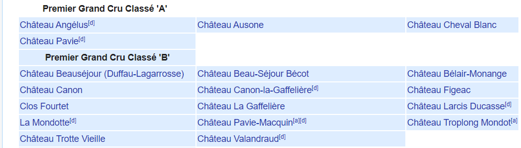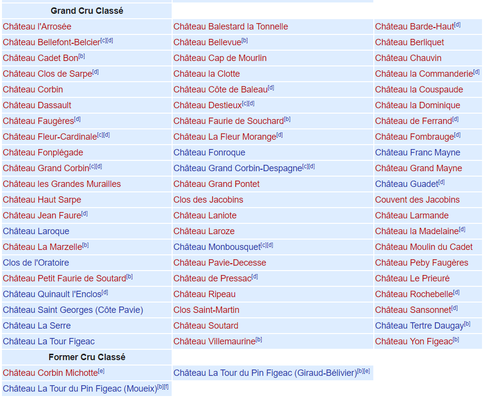 O Château la Clusière não está mais listado, pois agora faz parte do Château Pavie e o Château Curé-Bon-la-Madeleine não está mais listado, pois agora faz parte do Château Canon.