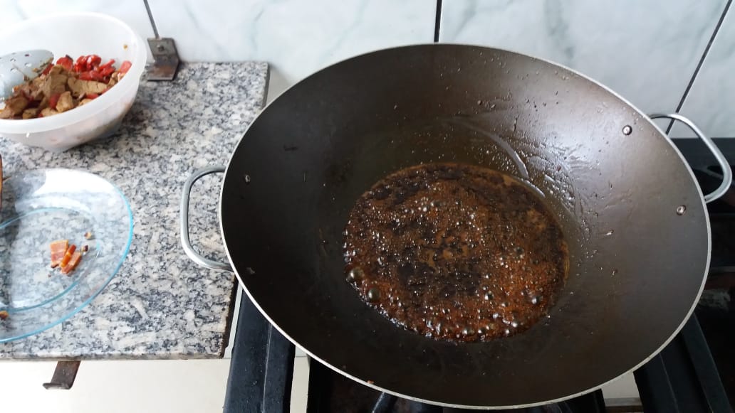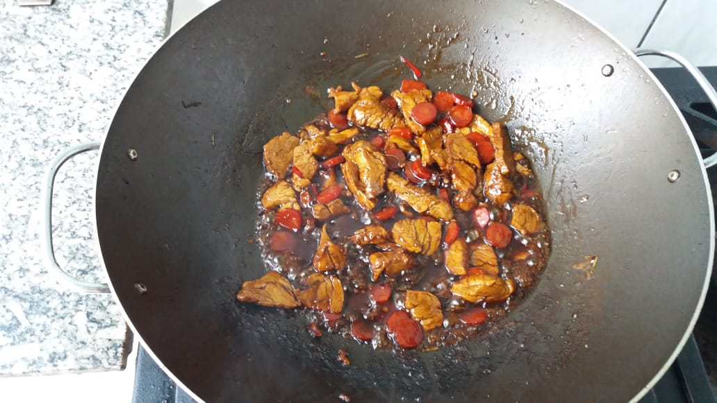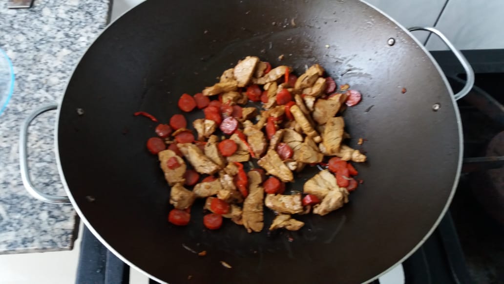 – Retorne a carne e a linguiça para a panela e caramelize um pouco, sem deixar queimar.