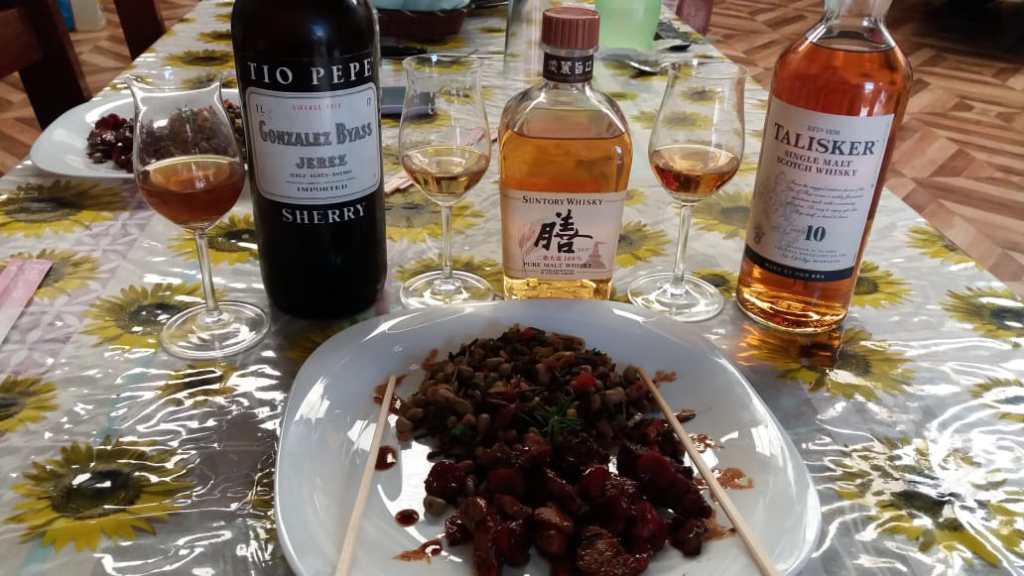 A carne de porco a moda oriental ficou muito boa com o Santory Whisky (mais suave) e não harmonizou nada com o Talisker (mais rustico e levemente turfado).