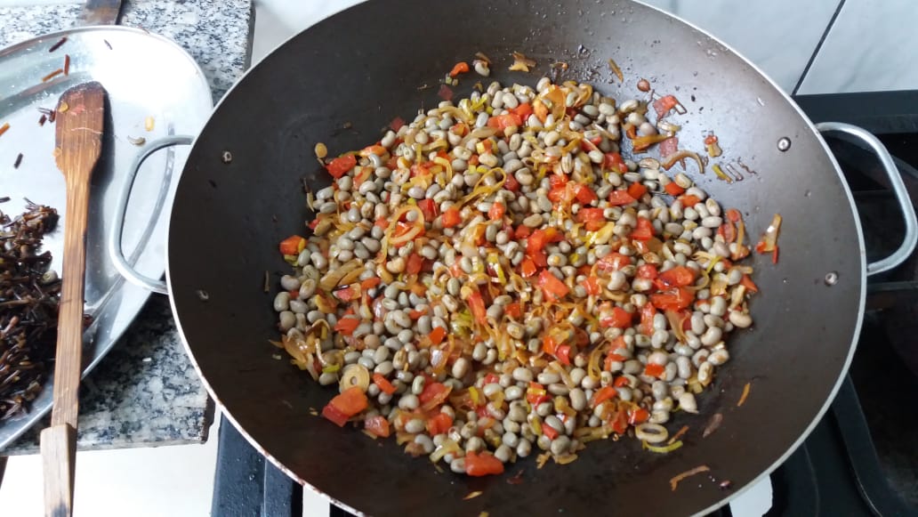 – Adicione o feijão cozido e misture bem, refogando por um minuto.