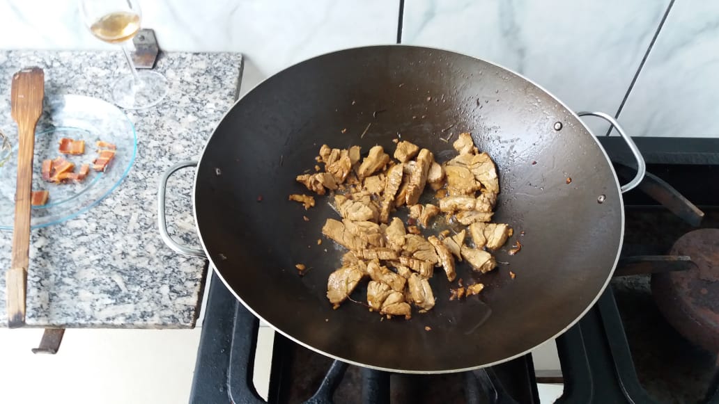 – Numa panela Wok, adicione o azeite e o bacon cortado em fatias e frite bem. Retire o bacon e use de aperitivo. O Bacon é só para aromatizar a gordura e tentar dar um toque defumado para harmonizar com o Single Malt.