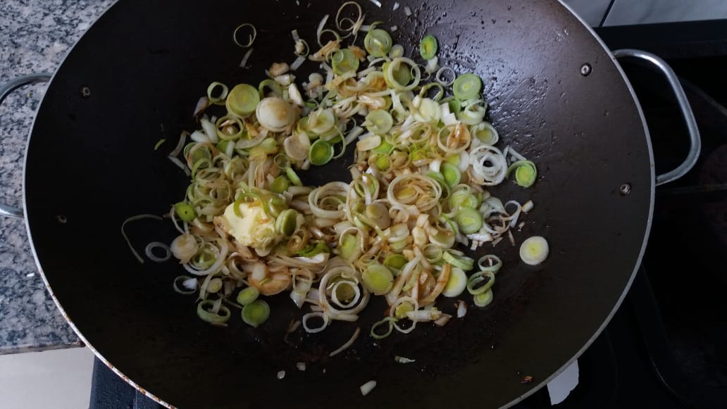 – Na mesma panela que fez a carne, adicione um pouco de azeite e a manteiga; frite o alho laminado, e refogue a cebola e o alho porró até murchar.