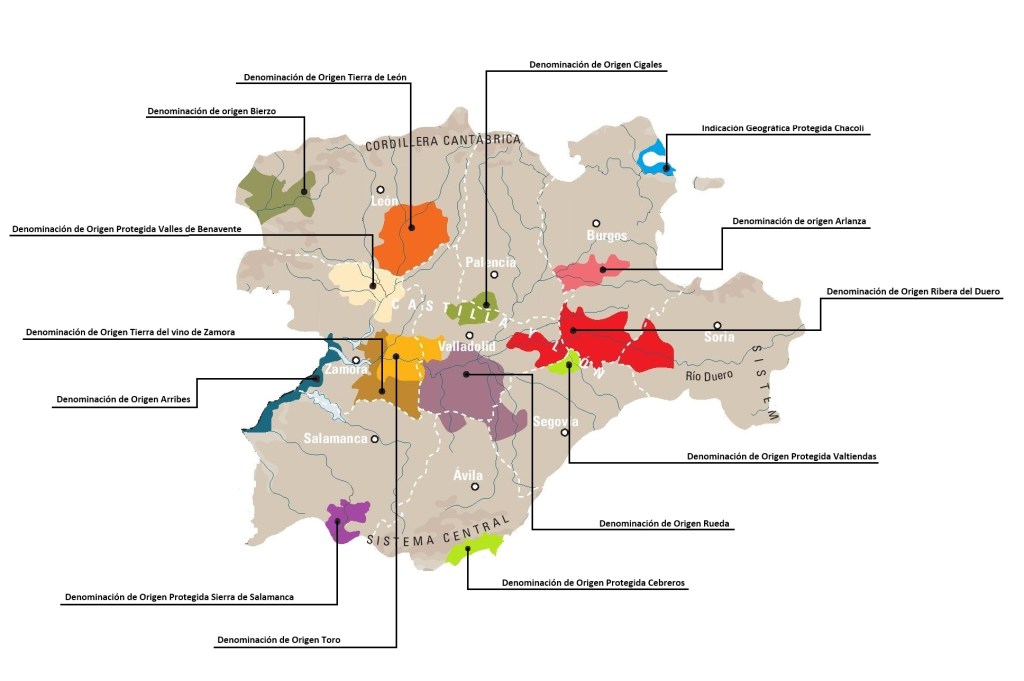 Em Castilla y León temos 13 Denominações de Origem Protegida (DOP), 1 Indicação Geográfica Protegida (IGP) e 1 VdlT Castilla y León