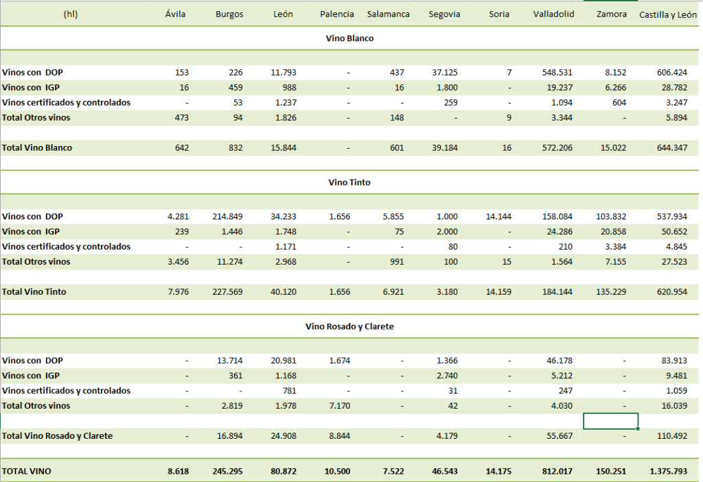A produção anual de vinhos em Castilla y León em 2017 foi de 1,37 Mhl e corresponde 4% da produção dos vinhos da Espanha.