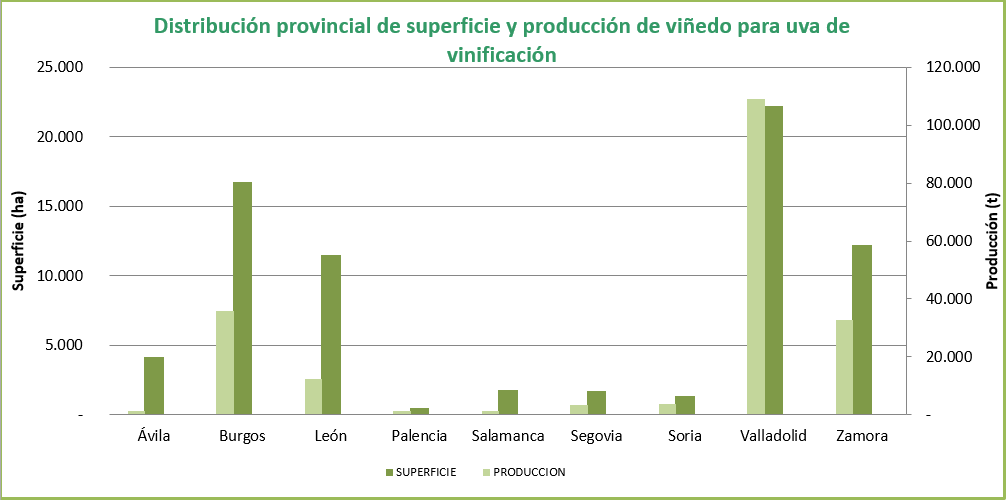 Embora seja a comunidade autônoma mais extensa da Espanha, com seus 9.422.689 hectares, a área de vinhedos de Castilla y León ocupa somente 76.000 hectares, compondo em torno de 8% dos 960.000 hectares da área total de vinhedos da Espanha.