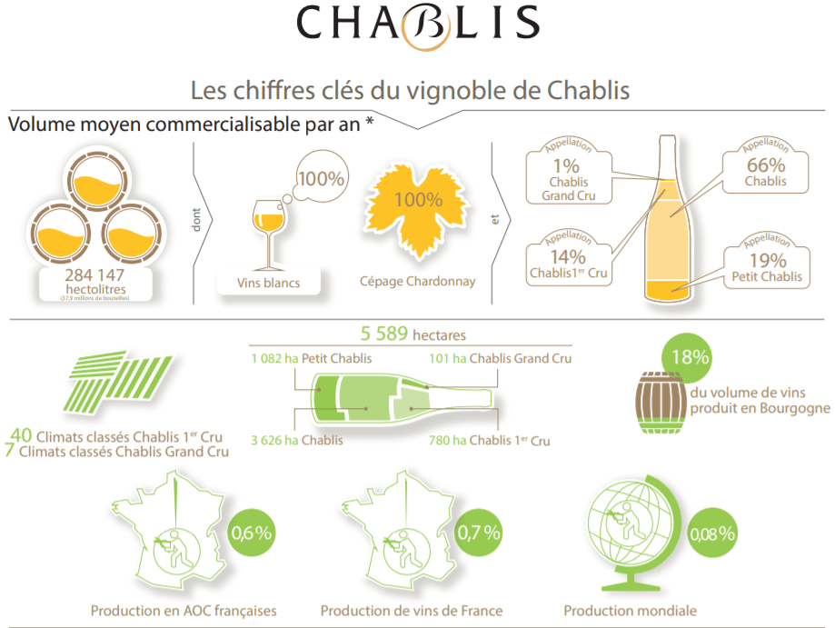 A região de Chablis se estende por 6.800 hectares, dos quais 5.687 hectares de vinhedos em produção, sendo 5.586 hectares na AOC Village e 101 hectares na AOC Grand Cru; a uva permitida é somente a Chardonnay e seu nível de classificação se divide em 04: