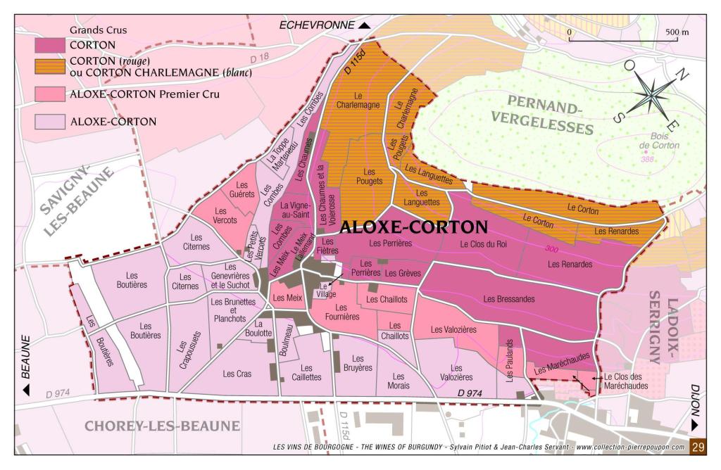 Compartilha a AOC Corton Charlemagne Grand Cru e AOC Corton Grand Cru com Pernand-Vergelesses e Aloxe-Corton