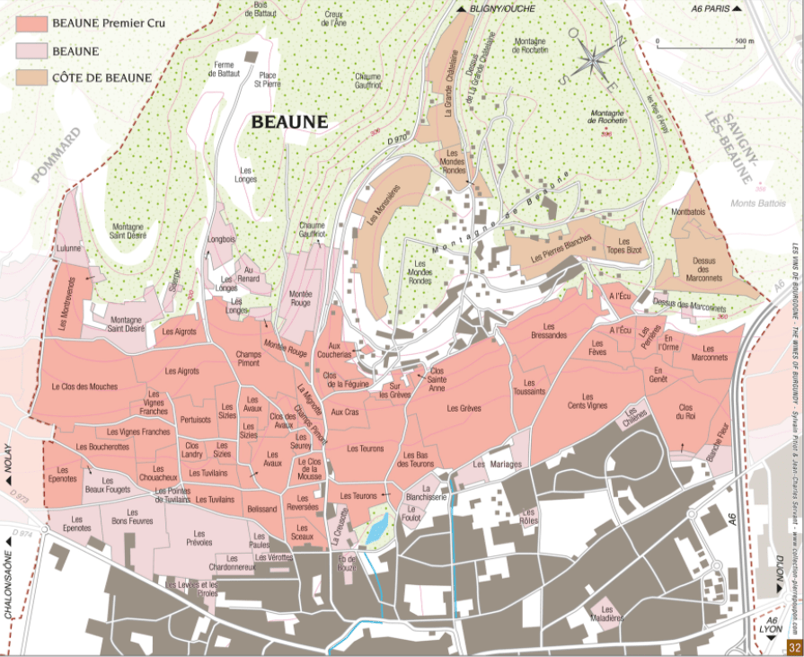 - A l’Ecu, Aux Coucherias, Aux Cras, Belissand , Blanches Fleurs, Champs Pimont, Clos de l’Ecu , Clos de la Feguine, Clos de la Mousse, Clos des Avaux, Clos des Ursules, Clos du roi , En Genêt, En l’Orme , La Mignotte, Le Bas des Teurons, Le Clos des Mouches, Les Aigrots, Les Avaux, Les Boucherottes, Les Bressandes, Les Cents Vignes, Les Chouacheux, Les Epenotes, Les Fèves, Les Grèves, Les Marconnets, Les Montrevenots, Les Perrières, Les Reversés, Les Sceaux, Les Seurey, Les Sizies, Les Teurons, Les Toussaints, Les Tuvilains, Les Vignes Franches, Montée Rouge, Pertuisots, Sur les Grèves, Sur les Grèves-Clos Sainte-Anne, Clos Saint-Landry