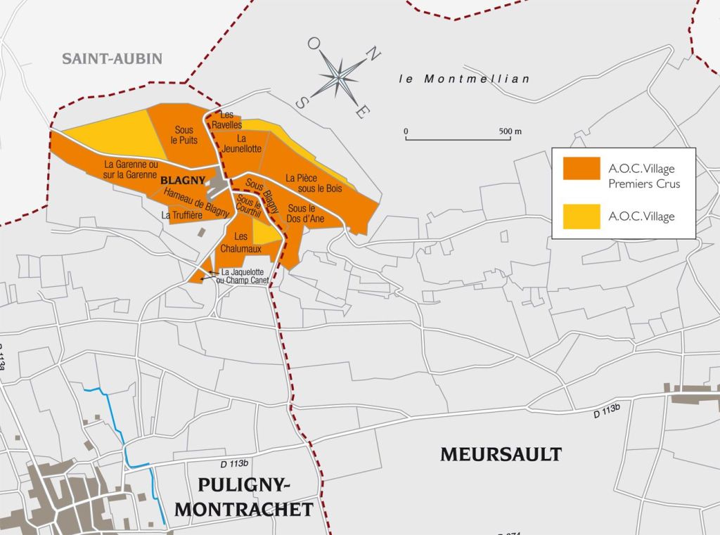 - Os Climats La Jeunelotte, La Piêce sous le Bois, Sous Blagny e Sous le Dos d’Ane ficam em Meursault e produzem Blagny Premier Cru (Pinot Noir) ou Meursault Premier Cru (Chardonnay)