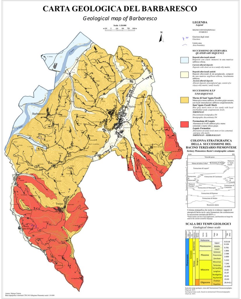 Sua área situa-se no Langhe, região geológica formada a 70 milhões de anos atrás, no período Terciário (Cenozócio), e nos sucessivos avanços e recuos do mar sobre a Planura Padana ao longo das eras (que deixou um grande deposito de cálcio), até culminar na formação de suas colinas sedimentares (20 a 10 milhões de anos), constituídas principalmente de solos Serravalian (mais antigos, vermelhos, compostos de Marga, Arenito, Calcário, Ferro e Fosforo- Vale de Serralunga) e solos Tortonian (mais novos, cinzas azulados, compostos de Argila, Marga, Arenito, Calcário, Manganês e Magnésio- Vale Central de La Morra e Barbaresco).