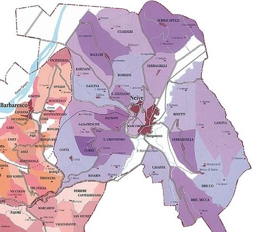 Albesani, Balluri, Basarin, Bordini, Bricco di Neive, Bric Micca, Canova, Cottà, Currà, Fausoni, Gaia-Principe, Gallina, Marcorino, Rivetti, San Cristoforo, San Giuliano, Serraboella, Serracapelli, Serragrilli e Starderi.