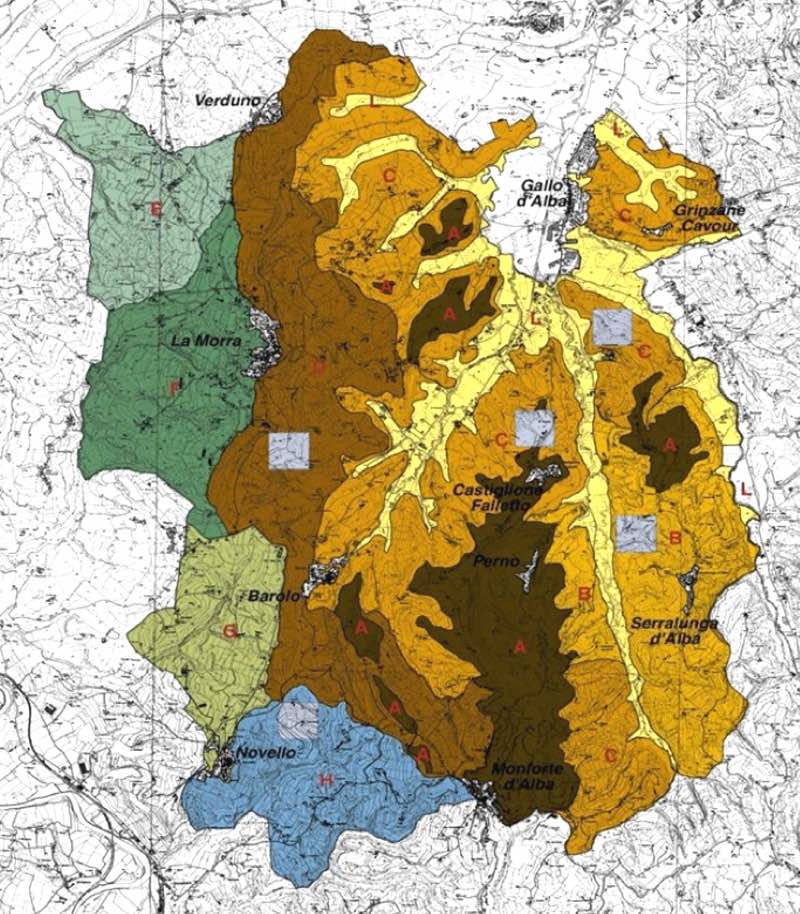 Sua área situa-se no Langhe, região geológica formada a 70 milhões de anos atrás, no período Terciário (Cenozócio), e nos sucessivos avanços e recuos do mar sobre a Planura Padana ao longo das eras (que deixou um grande deposito de cálcio), até culminar na formação de suas colinas sedimentares (20 a 10 milhões de anos), constituídas principalmente de solos Serravalian (mais antigos, vermelhos, compostos de Marga, Arenito, Calcário, Ferro e Fosforo- Vale de Serralunga) e solos Tortonian (mais novos, cinzas azulados, compostos de Argila, Marga, Arenito, Calcário, Manganês e Magnésio- Vale Central de La Morra e Barbaresco).