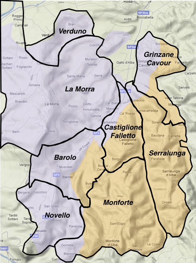 A zona de Barolo pode ser amplamente dividida em dois vales. O Vale de Serralunga a leste inclui as comunas de Castiglione Falletto, Monforte d’Alba e Serralunga d’Alba.