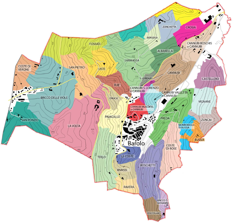 5- Barolo- 37 MGA- Albarella, Bergeisa, Boschetti, Bricco delle Viole, Bricco San Giovanni, Brunate, Bussia, Cannubi, Cannubi Boschis o Cannubi, Cannubi Muscatel o Cannubi, Cannubi San Lorenzo o Cannubi, Cannubi Valletta o Cannubi, Castellero, Cerequio, Coste di Rose, Coste di Vergne, Crosia, Drucà, Fossati, La Volta, Le Coste, Liste, Monrobiolo di Bussia, Paiagallo, Preda, Ravera, Rivassi, Ruè, San Lorenzo, San Pietro, San Ponzio, Sarmassa, Terlo, Vignane, Zoccolaio, Zonchetta e Zuncai.