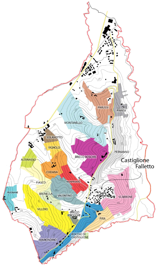 8- Castiglione Falletto- 20 MGA- Altenasso o Garblet Suè o Garbelletto Superiore, Bricco Boschis, Bricco Rocche, Brunella, Codana, Fiasco, Mariondino o Monriondino o Bricco Moriondino, Monprivato, Montanello, Parussi, Pernanno, Piantà, Pira, Pugnane, Rocche di Castiglione, Scarrone, Solanotto, Valentino, Vignolo e Villero.
