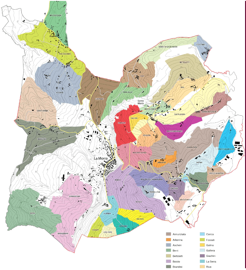 4- La Morra- 39 MGA- Annunziatta, Arborina, Ascheri, Berri, Bettolotti, Boiolo, Brandini, Bricco Chiesa, Bricco Cogni, Bricco Luciani, Bricco Manescotto, Bricco Manzoni, Bricco Rocca, Bricco San Biagio, Brunate, Capalot, Case Nere, Castagni, Cerequio, Ciocchini, Conca, Fossati, Gallina, Gattera, Giachini, La Serra, Rive, Rocche dell’Annunziata, Rocchettevino, Roere di Santa Maria, Roggeri, Roncaglie, San Giacomo, Santa Maria, Sant’Anna, Serra dei Turchi, Serradenari, Silio e Torriglione.