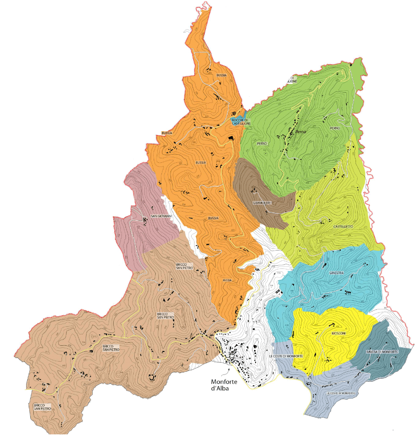 7- Monforte D’Alba- 11 MGA- Bricco San Pietro, Bussia, Castelletto, Ginestra, Gramolere, Le Coste di Monforte, Mosconi, Perno, Ravera di Monforte, Rocche di Castiglione e San Giovanni.