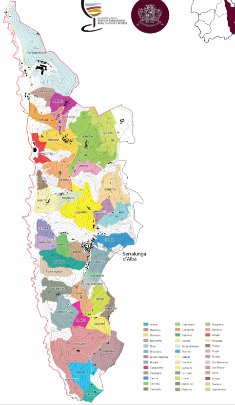 9- Serralunga D’Alba- 39 MGA– Arione, Badarina, Baudana, Boscareto, Brea, Briccolina, Bricco Voghera, Broglio, Cappallotto, Carpegna, Cerrati, Cerretta, Collaretto, Colombaro, Costabella, Damiano, Falletto, Fontanafredda, Francia, Gabutti, Gianetto, Lazzarito, Le Turne, Lirano, Manocino, Marenca, Margheria, Meriame, Ornato, Parafada, Prabon, Prapò, Rivette, San Bernardo, San Rocco, Serra, Sorano, Teodoro e Vignarionda.