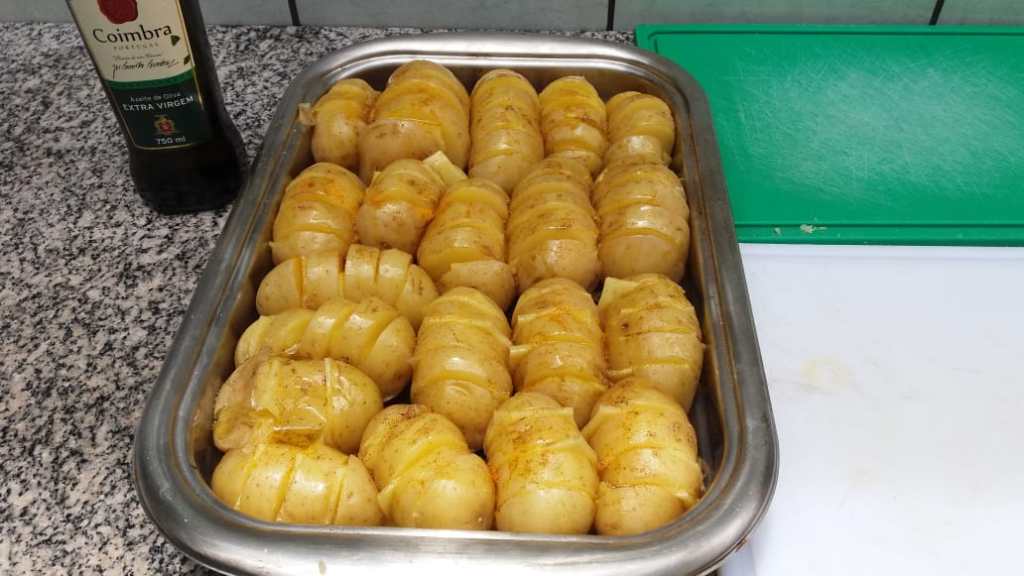 Assar por 30 minutos a 280º C, virando uma vez aos 15 minutos e no final retornando a posição inicial