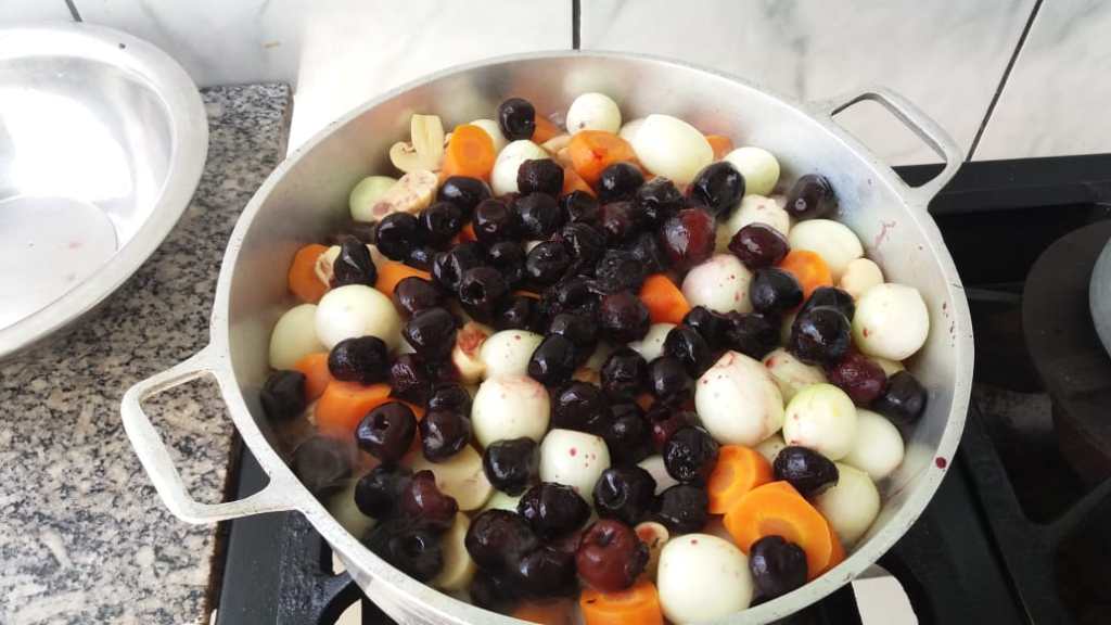 Cebolinhas, Cenouras e Champignons Paris ao molho de Armagnac e Cerejas.