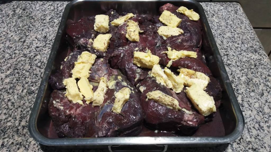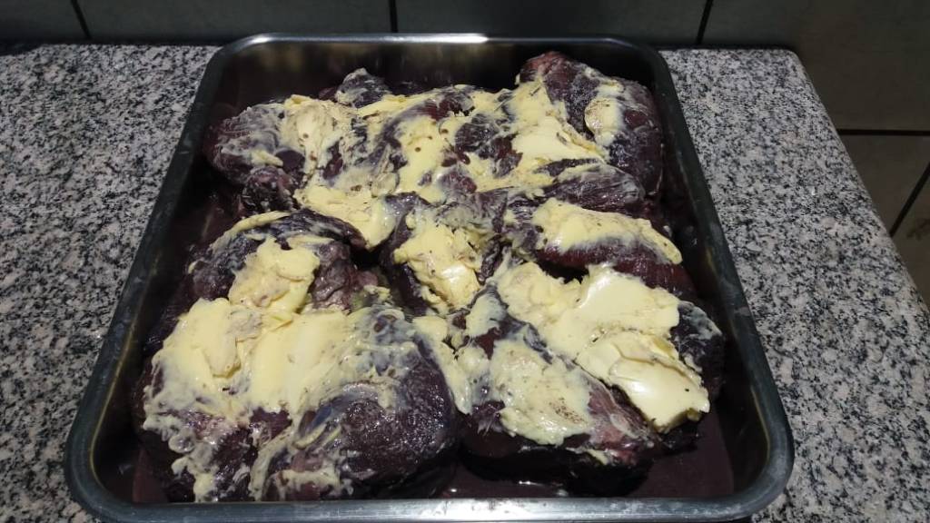 Passar o pernil para uma assadeira com um pouco da marinada e passar manteiga de boa qualidade por dentro e por fora do Pernil (200 g por pernil).