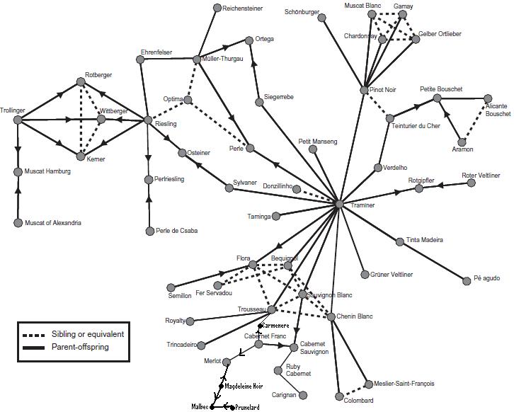 A uva é uma planta perene, propagada vegetativamente, sem cruzamento de espécies, o que significa que as cultivares antigas propagado por centenas ou mesmo milhares de anos podem coexistir com cultivares geradas a partir de cruzamentos recentes. O potencial para a autofecundação e cruzamentos, faz a reconstrução genealógica bastante difícil.