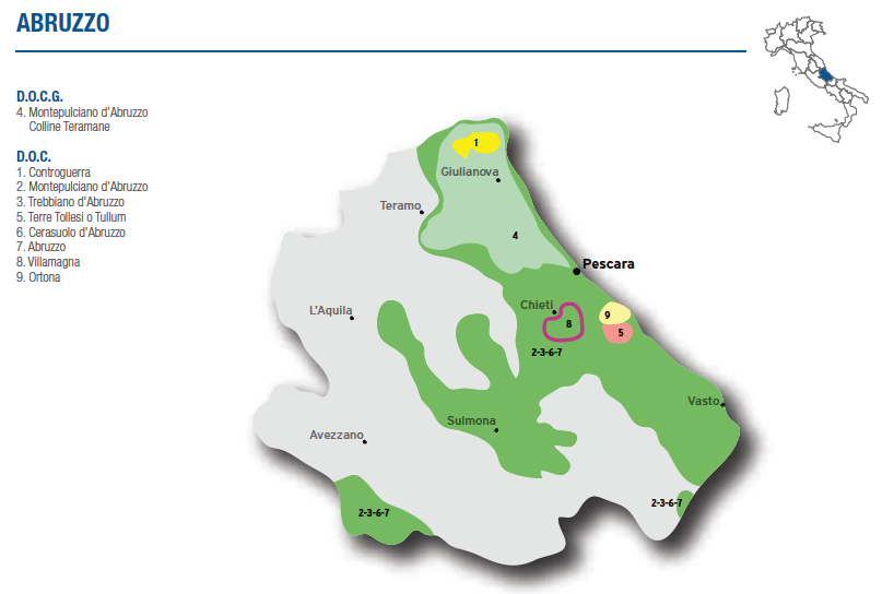 Possui 02 DOCG (Terre Tollesi o Tullum passou a DOCG em 2019) e 07 DOC