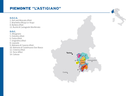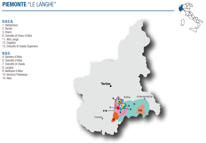 Possui 05 DOCG (acrescentou a DOCG Nizza em 2014) e 10 DOC