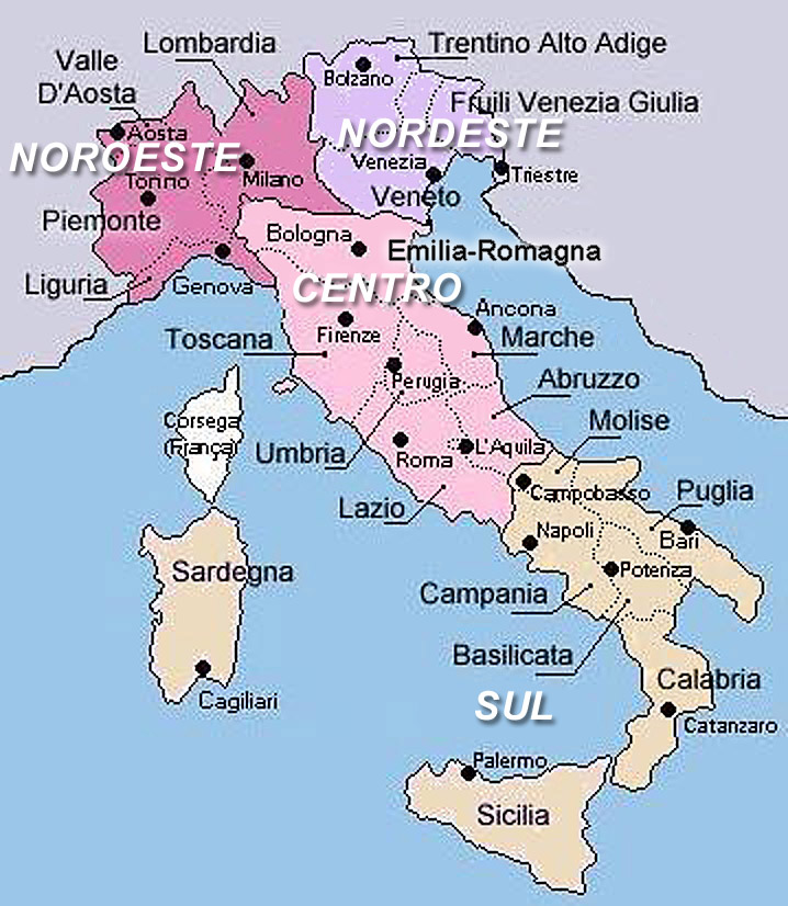 Podemos dividir as regiões vinícolas italianas em 04 grandes regiões: Noroeste, Nordeste, Centro e Sul/Ilhas.