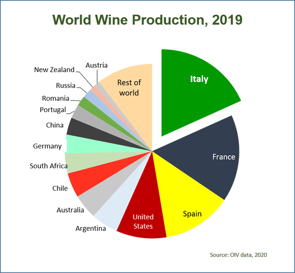 Em 2018 a Itália figura como o quarto pais em área de vinhedos plantados, com 705 mil hectares e desde 2015 (depois de alternar com a França em anos anteriores) tem se consolidado como o maior produtor de vinhos do mundo, com uma produção anual na faixa de 50 milhões de hectolitros, dos quais 20 milhões de hectolitros são exportados (atrás somente da Espanha com 21 mhl), gerando uma receita de 6 bilhões de euros (atrás somente da França com 9 bilhões).