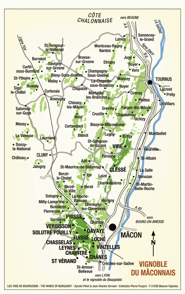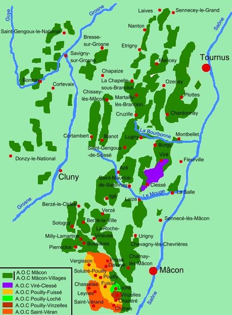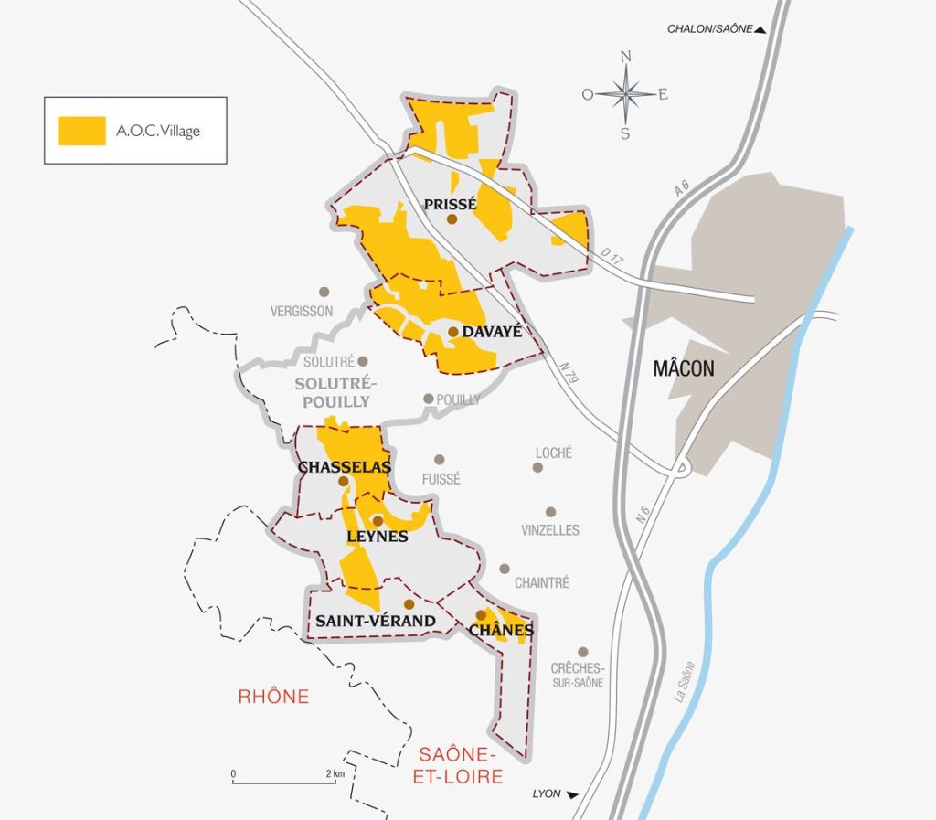 - Villages: Azé, Bray, Burgy, Bussières, Chaintré, Chardonnay, Charnay-lès-Mâcon, Cruzille, Davayé, Fuissé, Igé, Loché, Lugny, Mancey, Milly-Lamartine, Montbellet, Péronne, Pierreclos, Prissé, La Roche-Vineuse, Saint-Gengoux-le-National, Solutré-Pouilly, Uchizy, Vergisson, Verzé, Vinzelles.