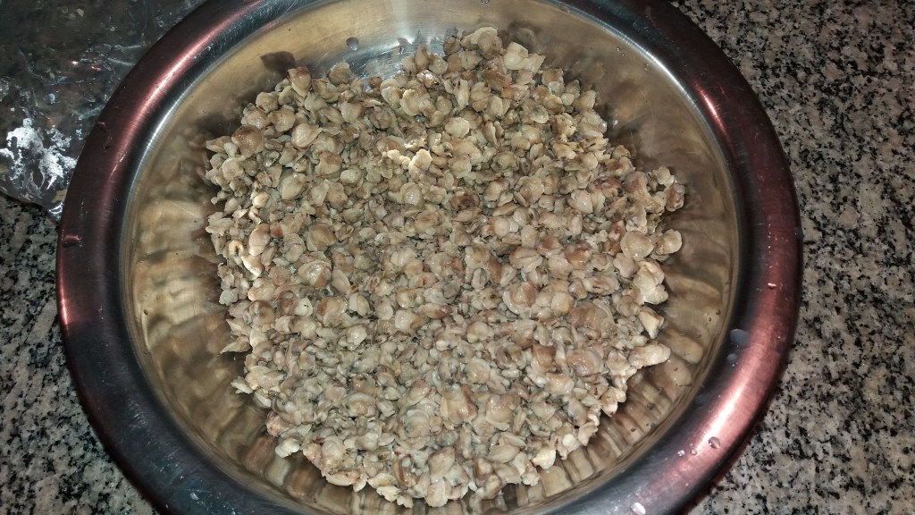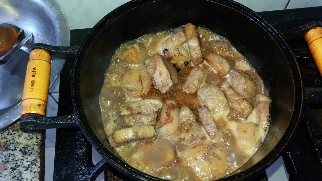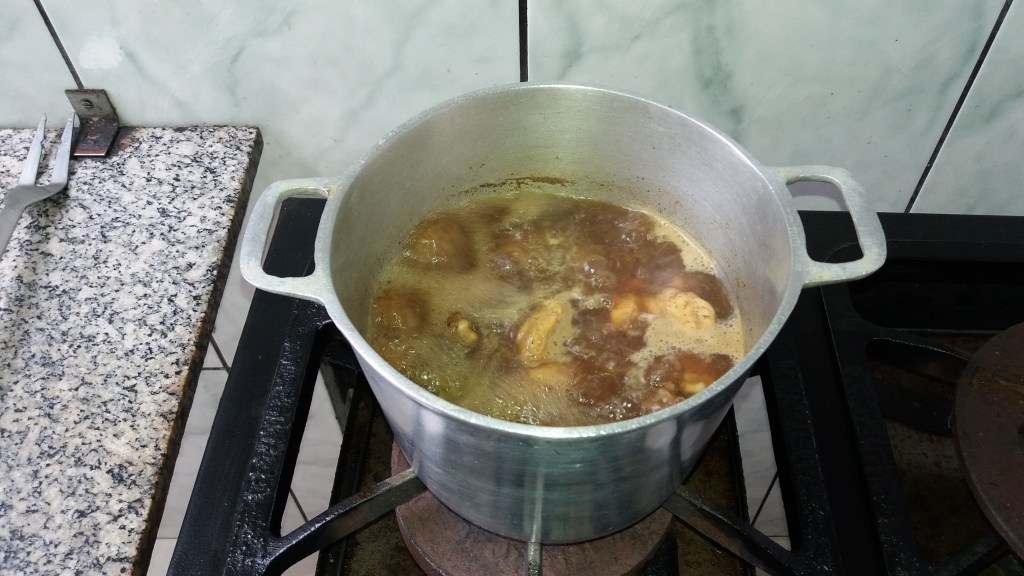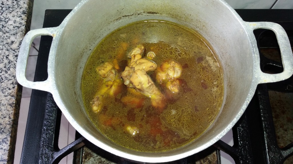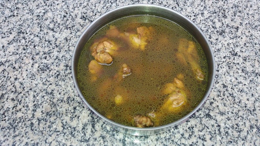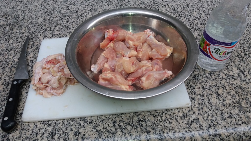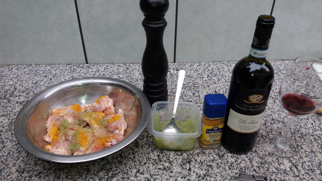 – Frango (dois dias antes)- Tire toda a pele da coxinhas de frango, deixe 10 minutos em agua com vinagre, lave e tempere com sal, pimenta, alho, cebola, cúrcuma e vinho branco ou tinto ligeiro, deixe marinar de um dia para o outro; no outro dia leve para uma panela e cozinhe toda a marinada por 5 minutos. Reserve na geladeira, tipo confit.