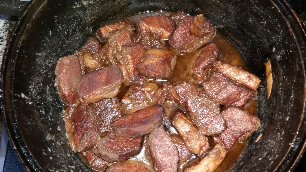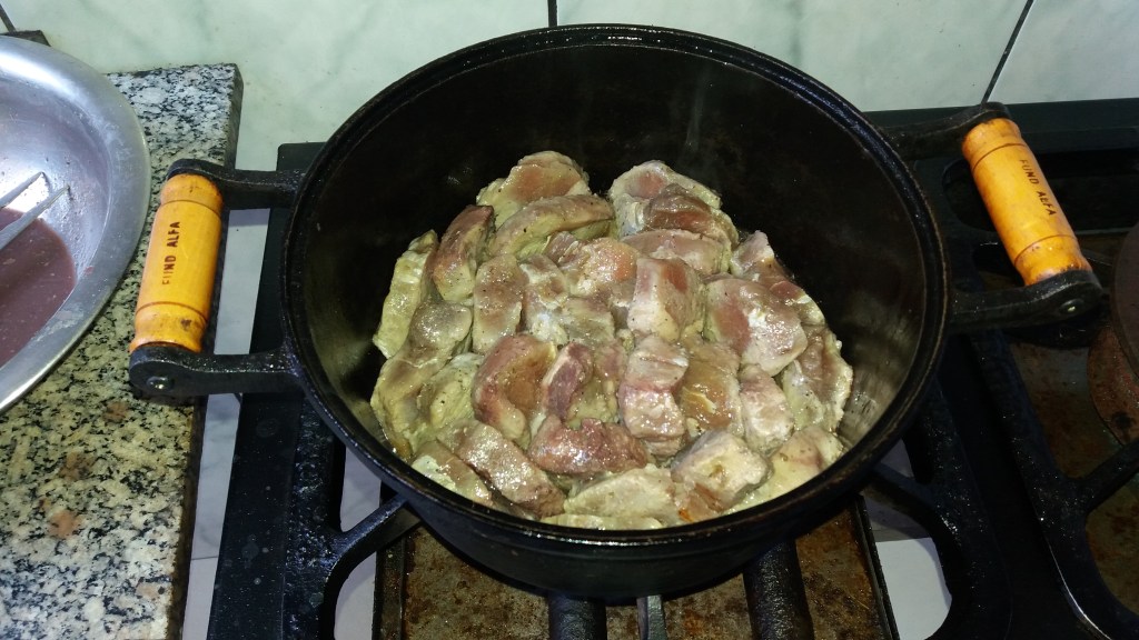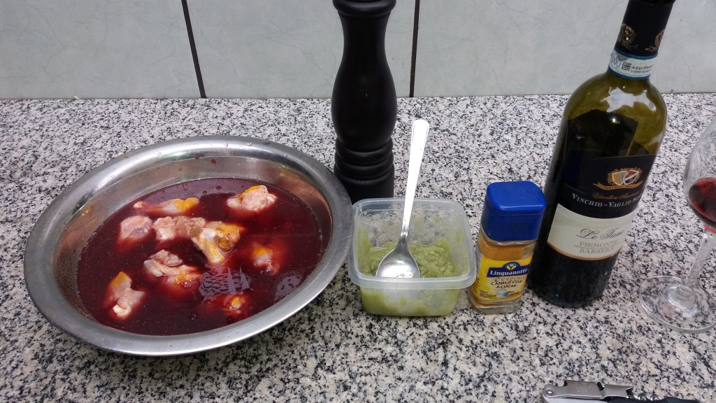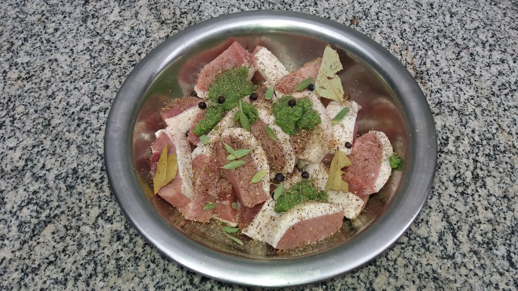 – Javali (um dia antes)- Corte em pedaços médios, tempere com sal, pimenta, salvia, zimbro, louro e vinho tinto; marine de um dia para outro.