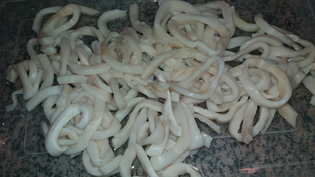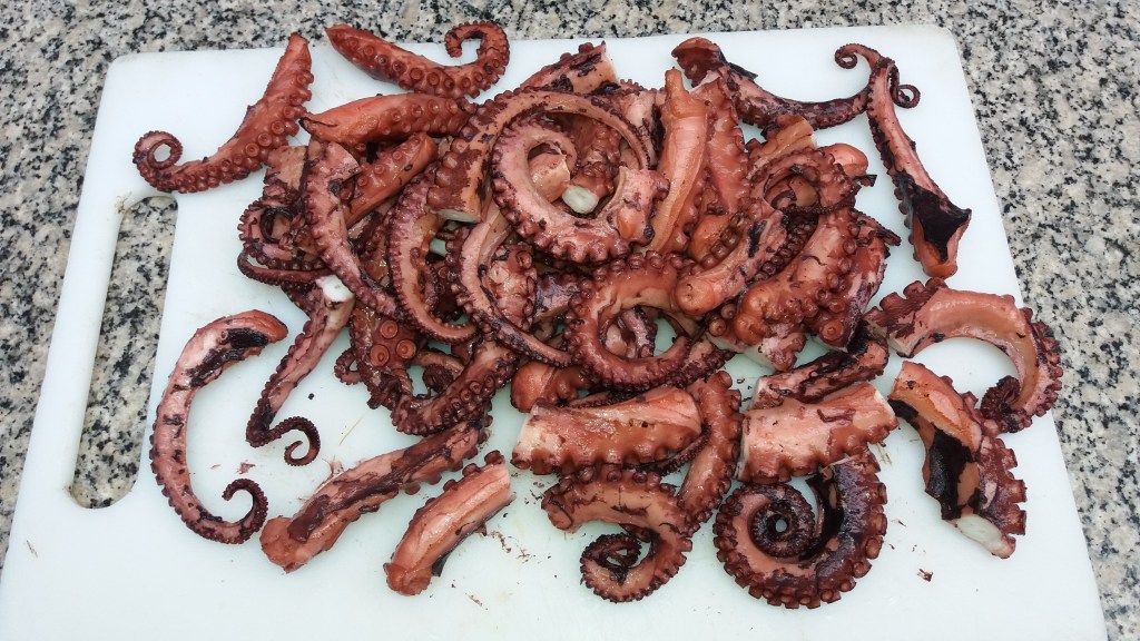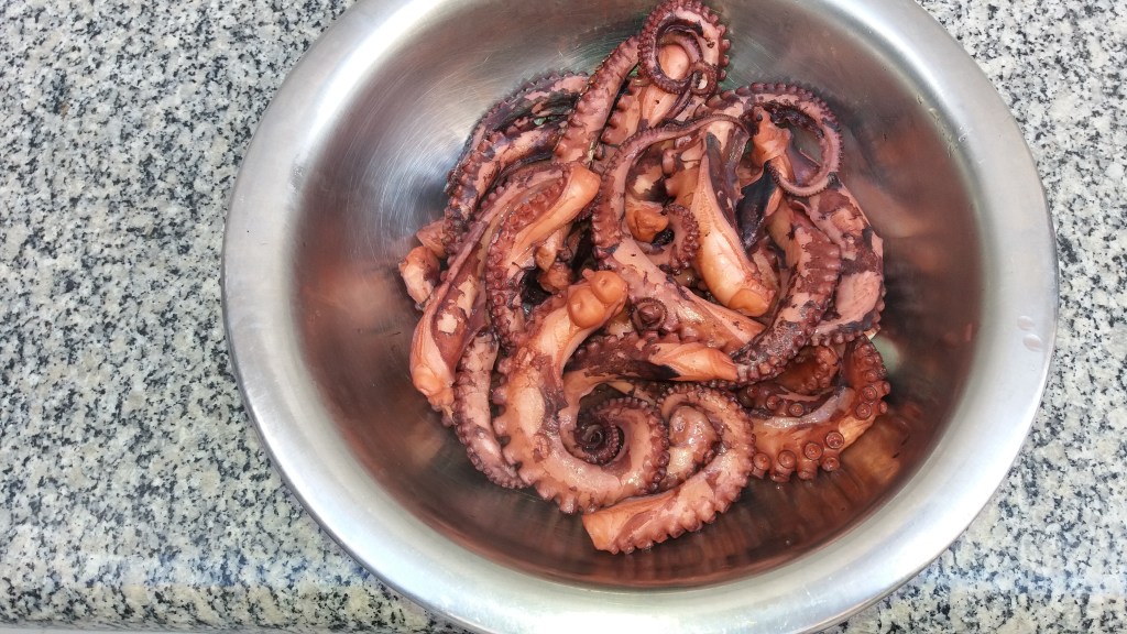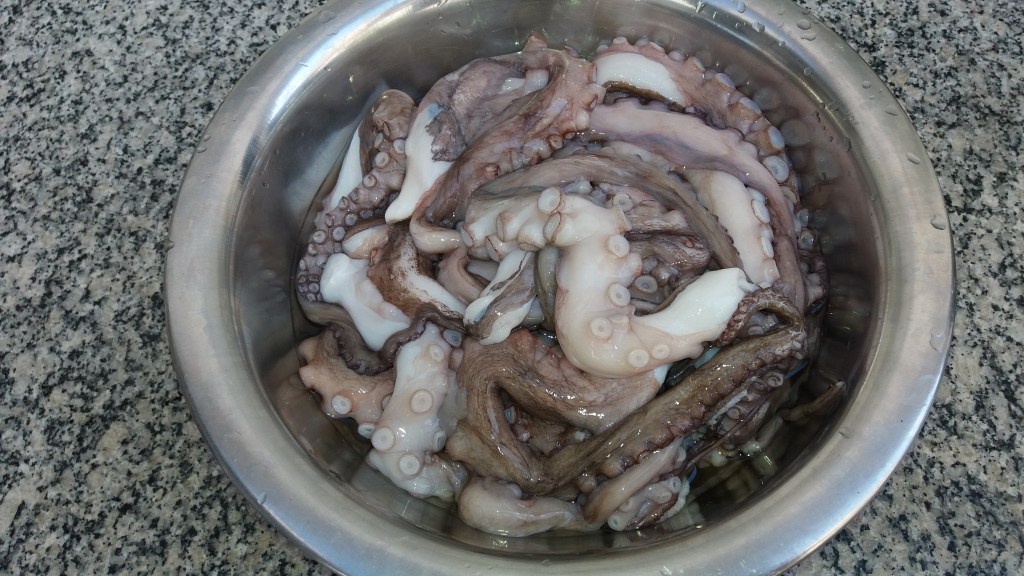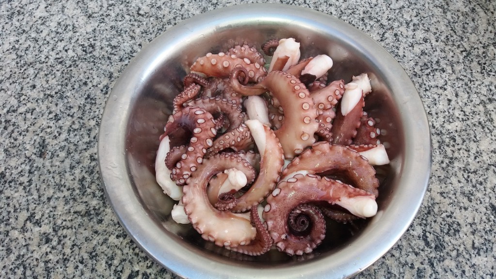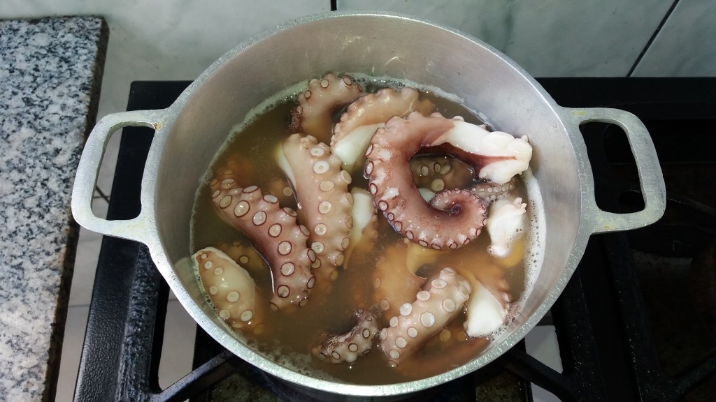 – Polvo (um dia antes)- Lave bem todo tentáculos, limpando bem o lodo das ventosas; com os tentáculos inteiros, de uma leve escalfada até ferver; escorra e jogue agua de fervura fora.