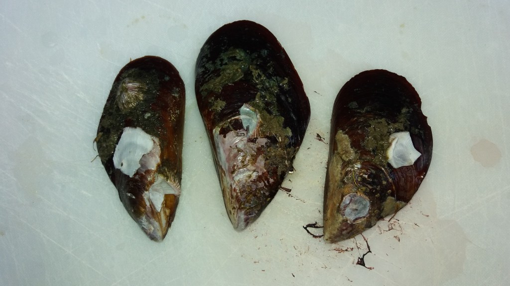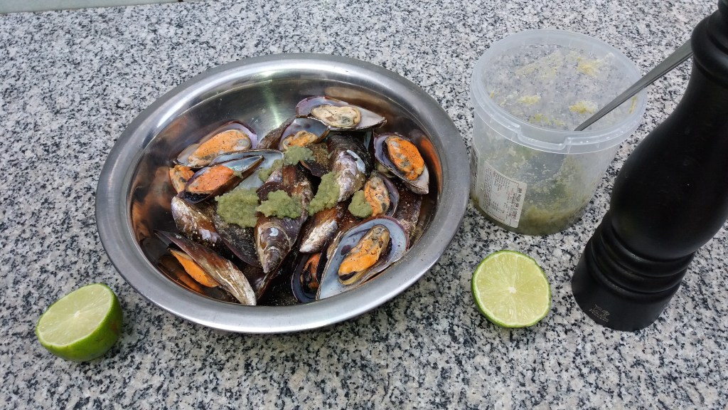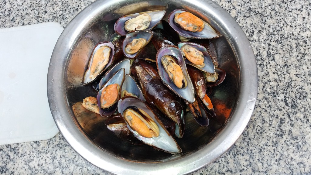 – Mariscos meia casca– com uma faquinha, limpe toda as cracas incrustadas nas conchas do marisco. Limpe os mariscos, retirando qualquer barba (fibras) que eles tenham. Temperar com sal, pimenta e limão. Reservar.