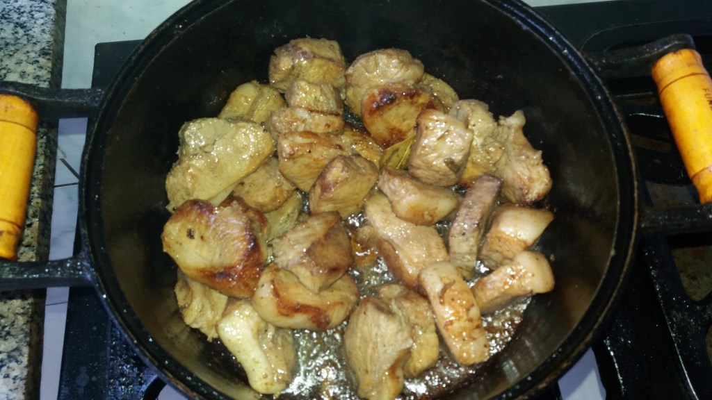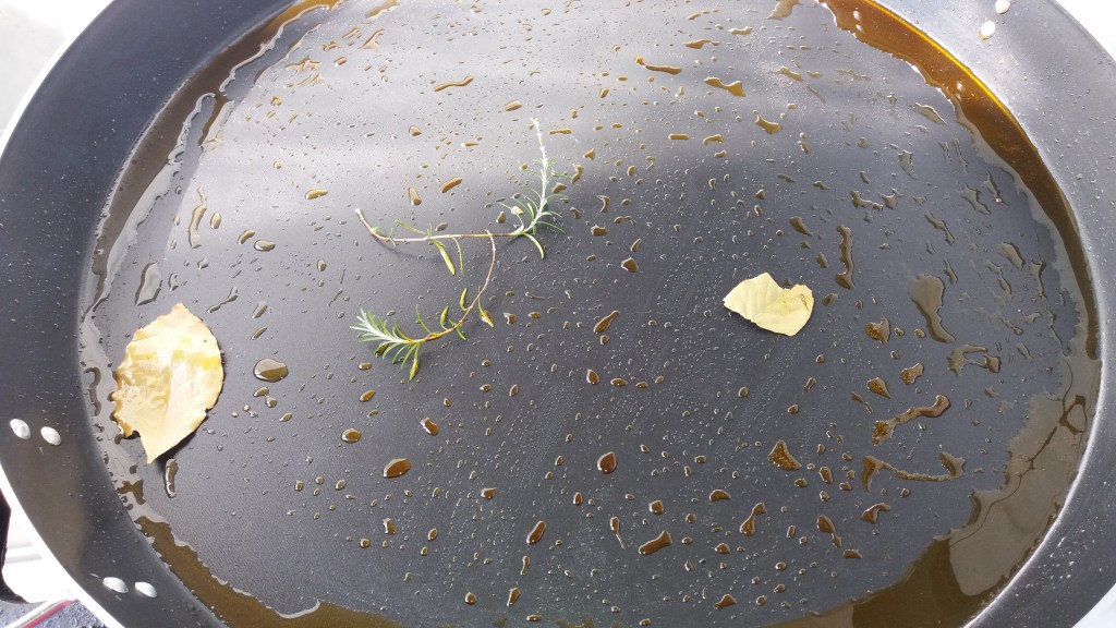 – Javali– Numa panela de ferro, coloque um pouco de óleo, frite o louro da marinada, frite os pedaços de Javali até dourar bem, adicione a marinada e cozinhe até secar; vá pingando agua até ficar ao dente (40 minutos), pois ainda vai cozinhar mais na paellera. Reserve