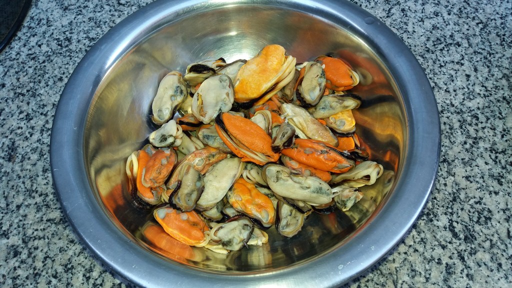 – Mariscos– Limpe os mariscos, retirando qualquer barba (fibras) que eles tenham. Temperar com sal, pimenta e limão. Reservar.