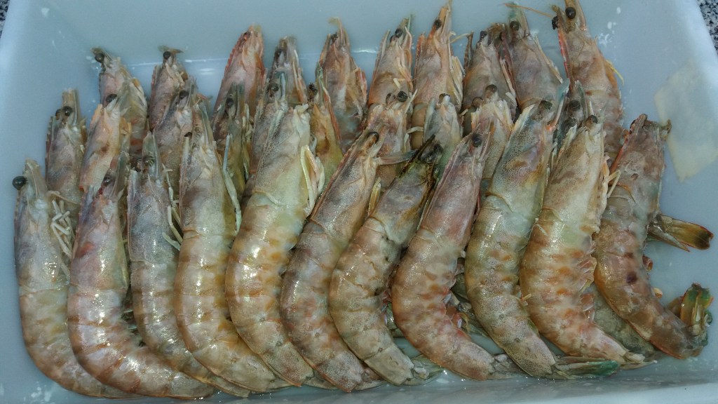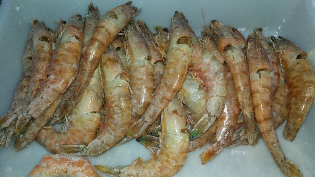 – Camarões GG sem casca– se já estiverem limpos, bem, senão limpe-os, cortando a costa com uma faca afiada e retire os intestinos. Tempere igual o camarão com casca.