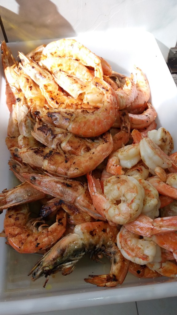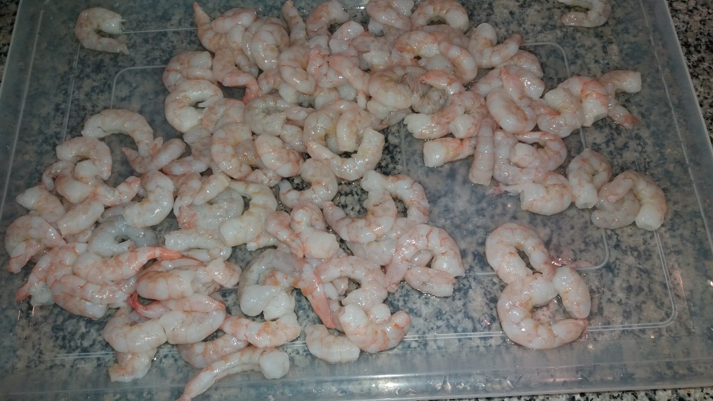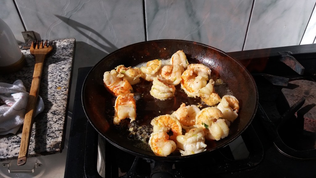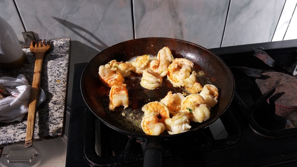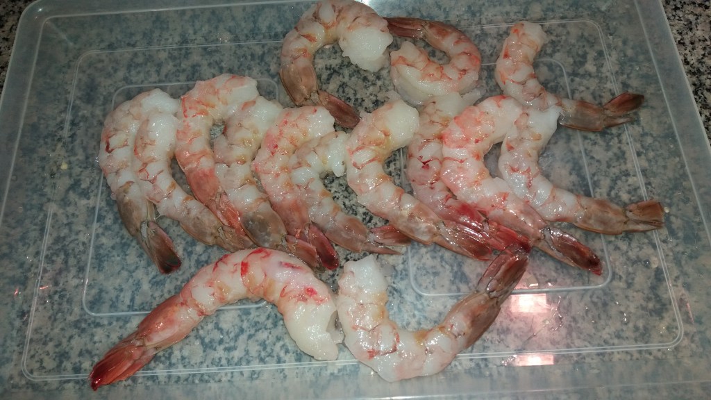– Camarões médios ou pequenos sem casca– se já estiverem limpos, bem, senão limpe-os, cortando a costa com uma faca afiada e retire os intestinos (se forem muito pequenos, limpar o que der). Tempere igual o camarão com casca.