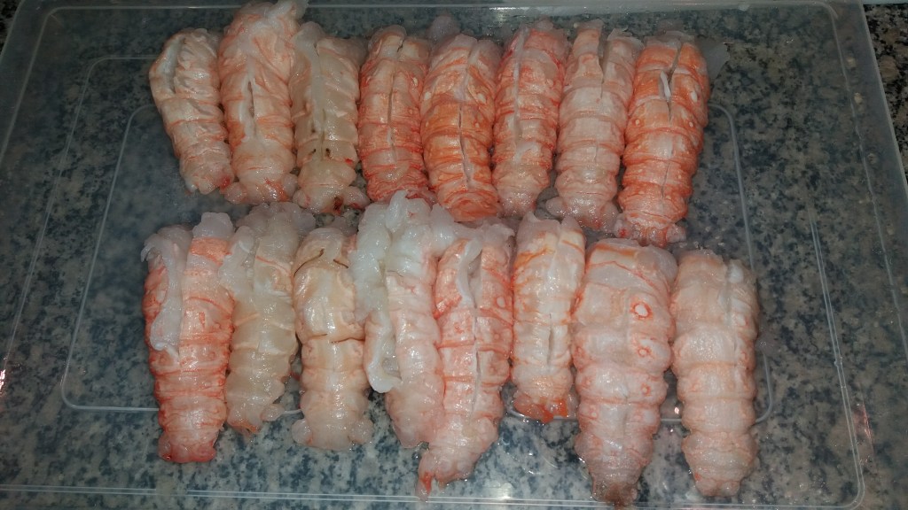 – Caudas de Lagosta– se já estiverem limpas, bem, senão limpe-as, cortando a costa com uma faca afiada e retire os intestinos. Tempere igual o camarão com casca.