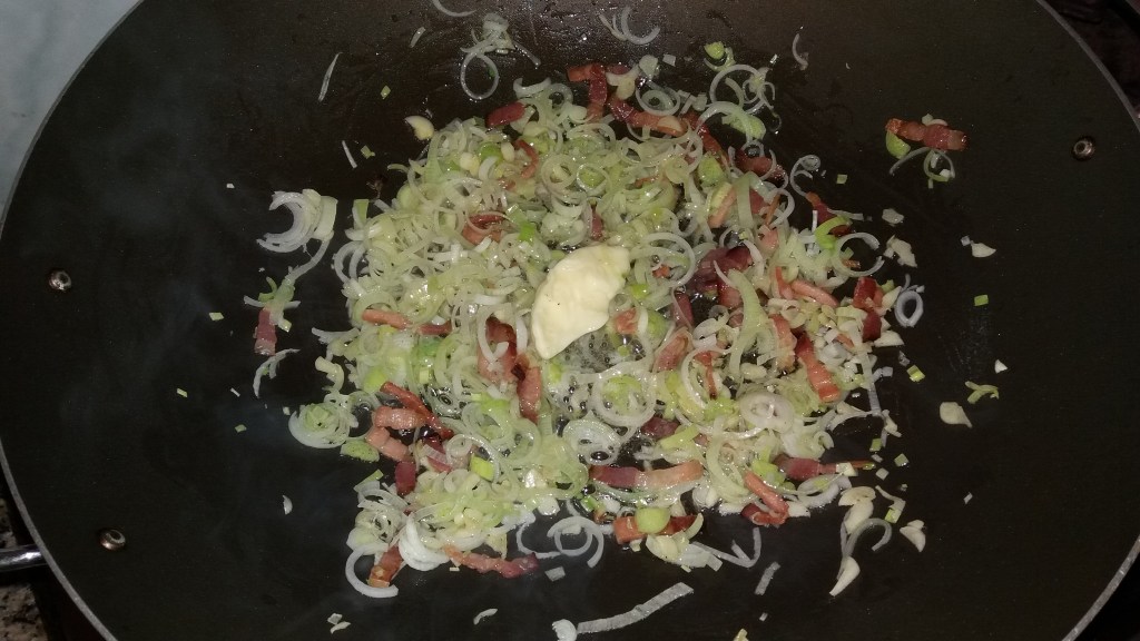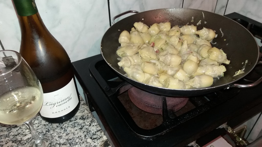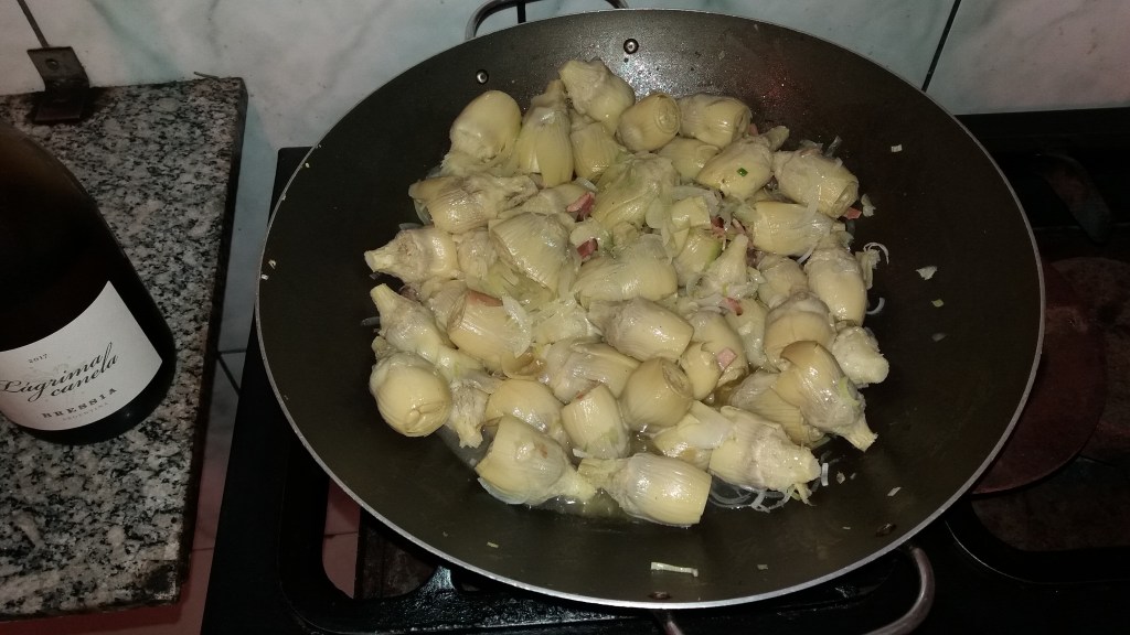 Numa frigideira grande ou wok, frite um pouco dos bacon fatiados, adicione um pouco de azeite de oliva e manteiga (triplo burro), frite um pouco de alho laminado, alho porro e cebola fatiados, adicione as alcachofras, tempere com sal e pimenta; adicione 200 ml de vinho branco e cozinhe rapidamente até secar. Reserve.
