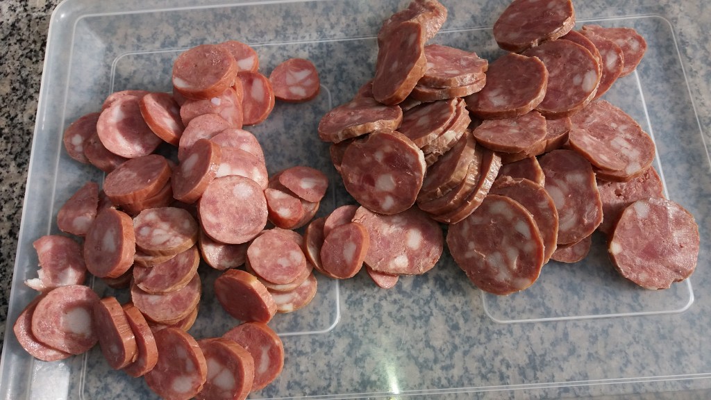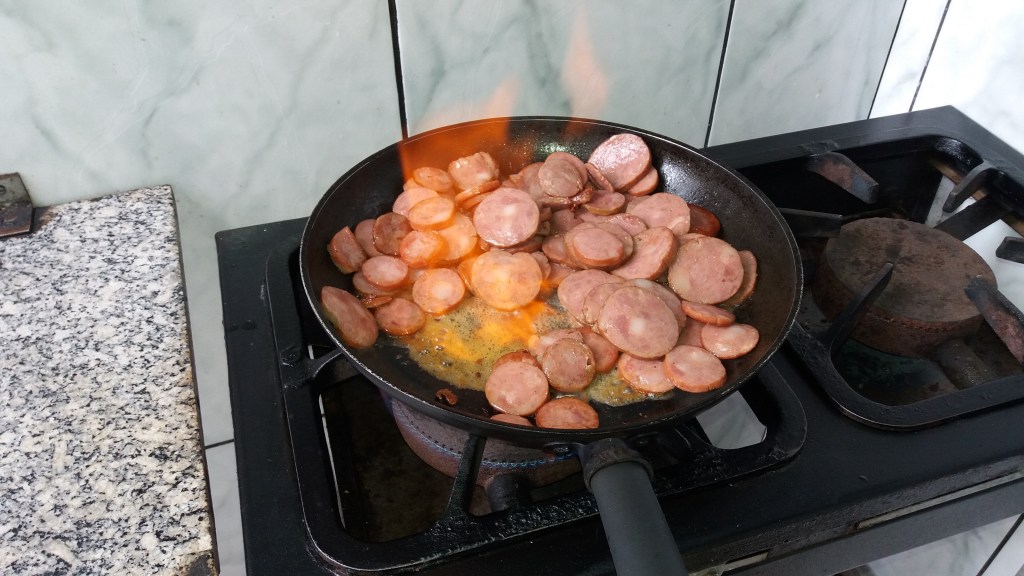 – Paio ou Calabresa defumada nacional– Tirar a pele, fatiar, fritar levemente numa frigideira para retirar o excesso de gordura, descartar a gordura que sair; retornar ao fogo e flambar com cachaça (uso com Cambuci). Reservar