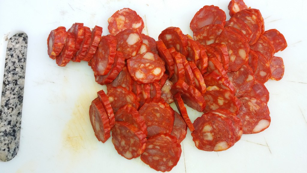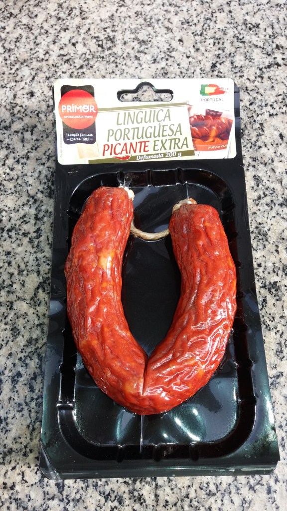 – Linguiça Portuguesa Primor Extra picante (com paprika)- retirar a pele e fatiar fino. Reservar.