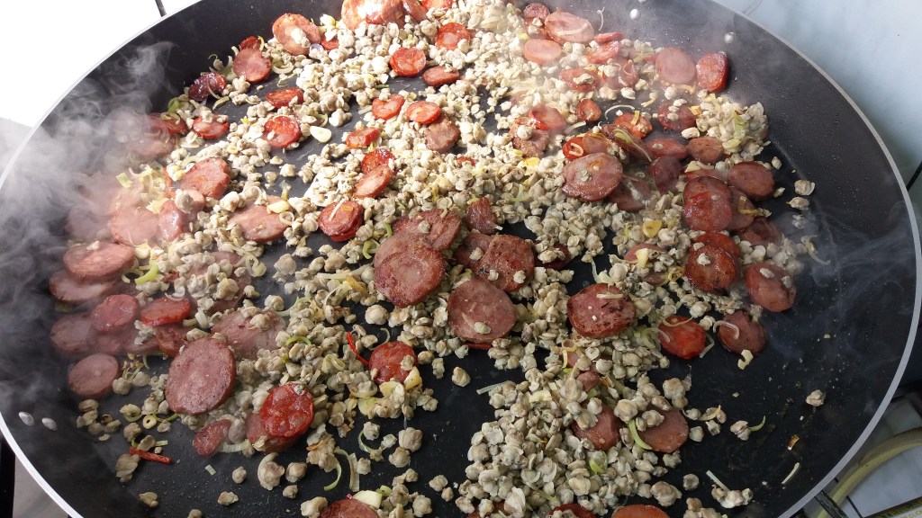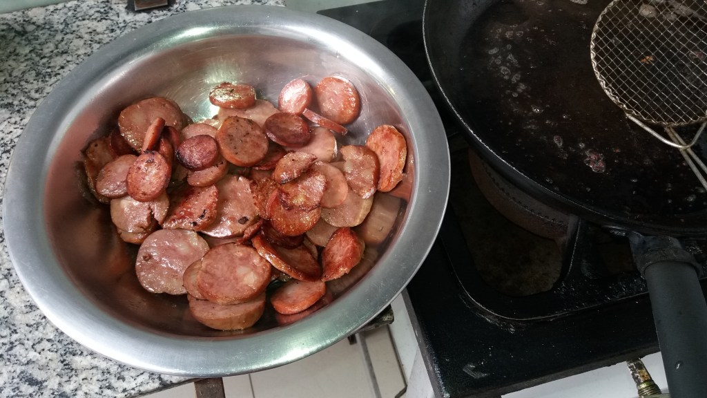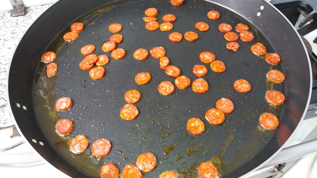 – Adicione um pouco de azeite na paellera e frite as linguiças portuguesas, para soltar um pouco de tinta de páprica, retire e reserve.