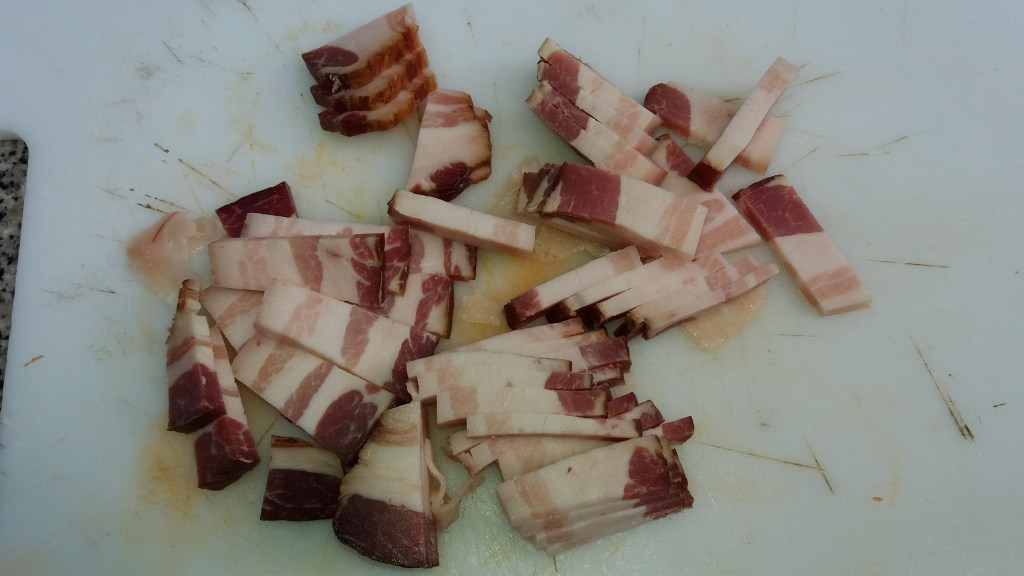 – Bacon– Descartar a pele e fatiar. Reservar.