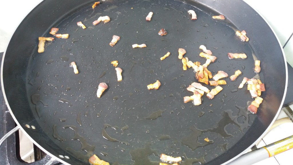 – Numa paellera de 60/70 cm, adicione os bacon, frite e retire. Use como petisco ao longo do preparo e vá bebericando um bom vinho.