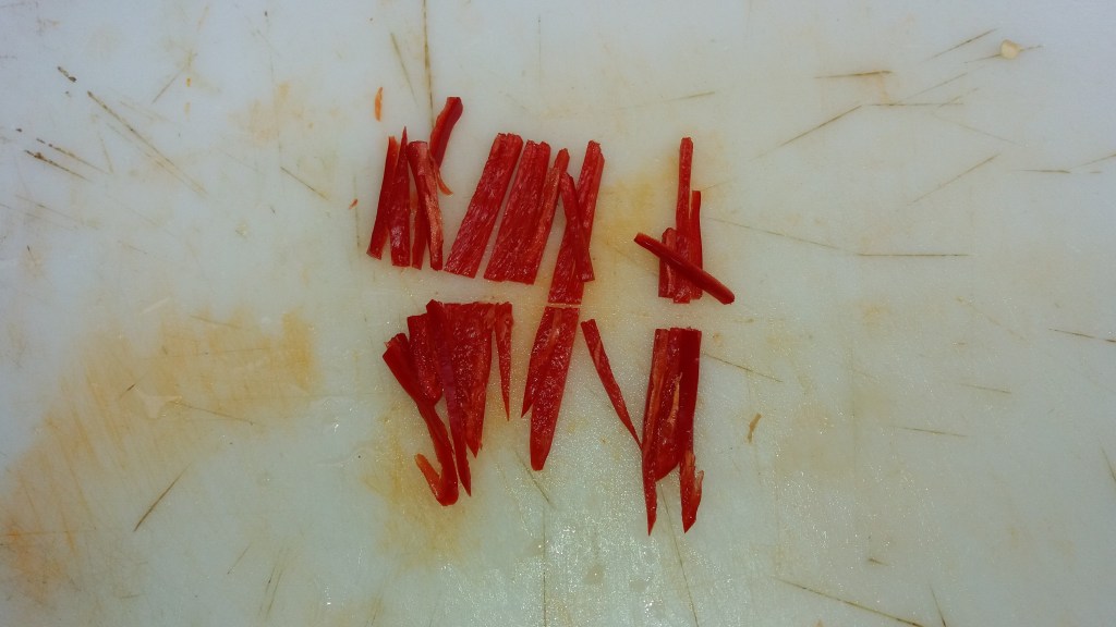 – Pimenta dedo de moça– Retire as sementes e parte branca, e fatie fininha.