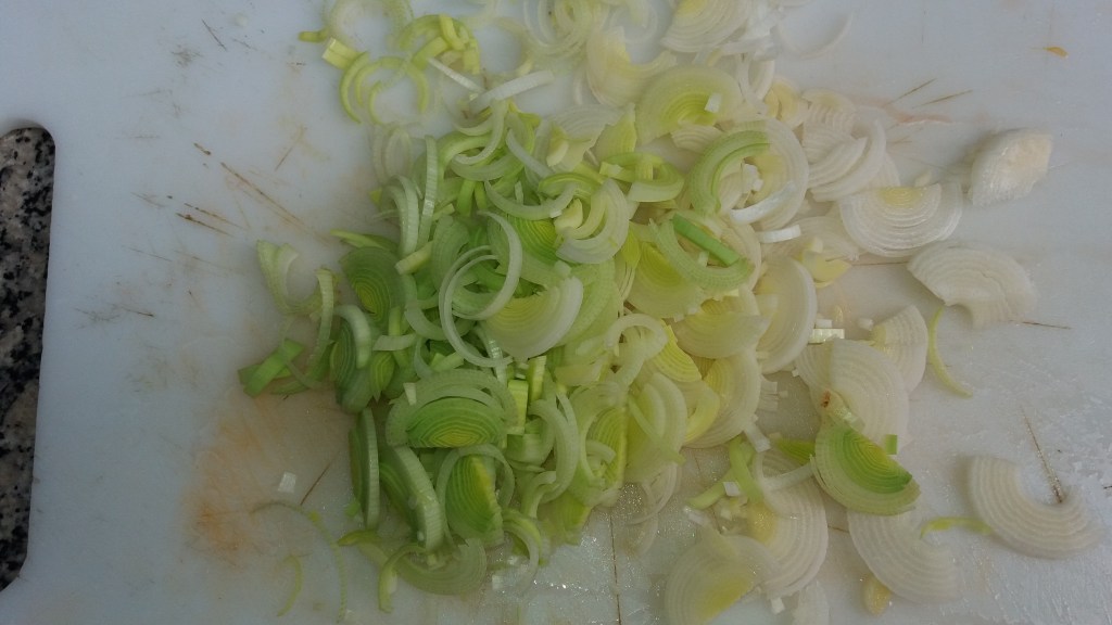 – Alho Porró (2 talos) – corte as extremidades, lave bem para retirar a terra, fatie e reserve.