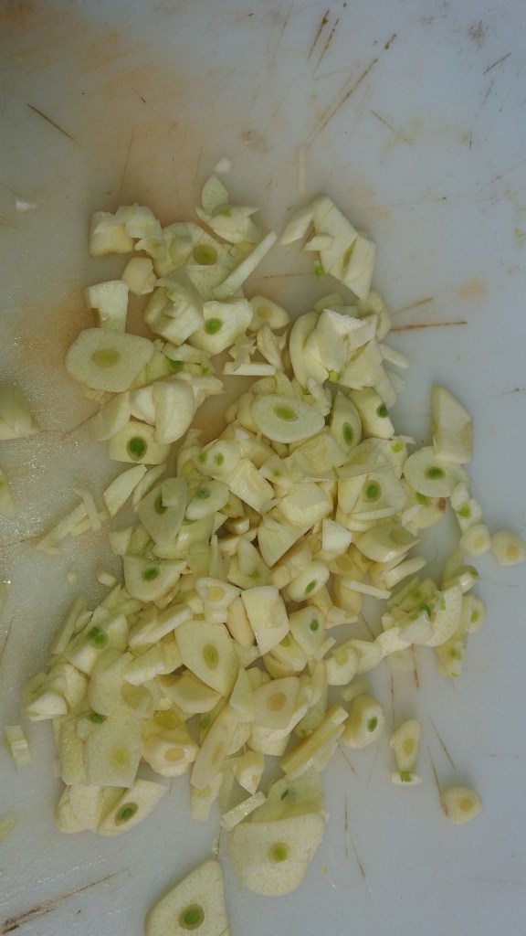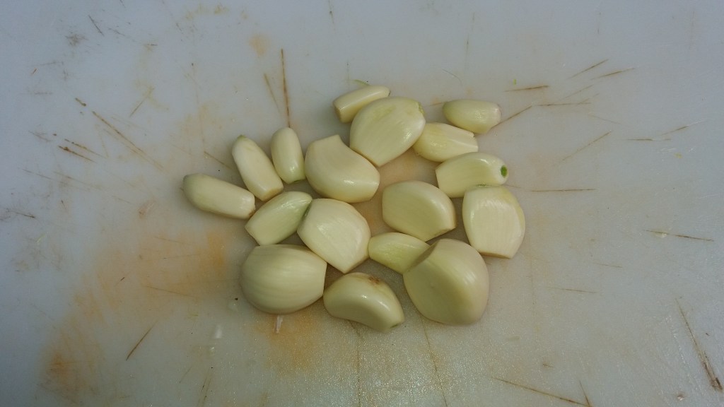 – Alho (a gosto, eu uso duas cabeças) – descasque e lamine. Reserve