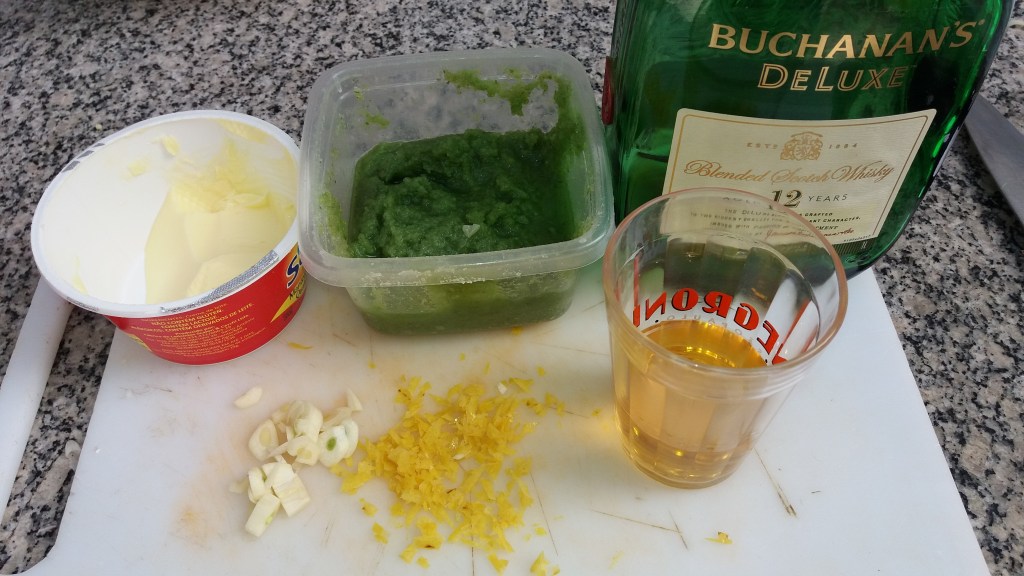 Grelhar as caudas de Lagostas em manteiga aromatizada com alho, e raspas de casca de limão siciliano, dando uma breve flambada com Whisky. Reserve